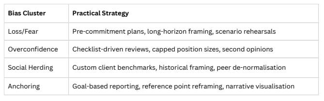 To counter these biases, advisers need more than technical skill — they need process, structure, and client alignment. Below is a summary of practical strategies mapped to each bias cluster.