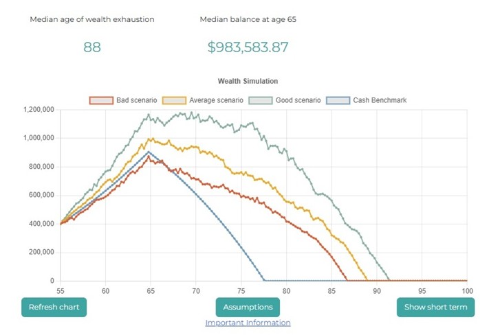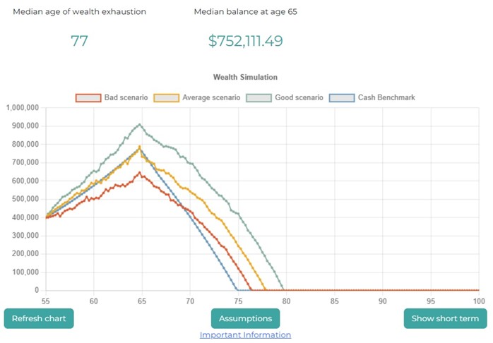 Action taken: Modest portfolio reallocation and savings changes lift exhaustion age to 88 – a clear example of risk targeting improving outcomes