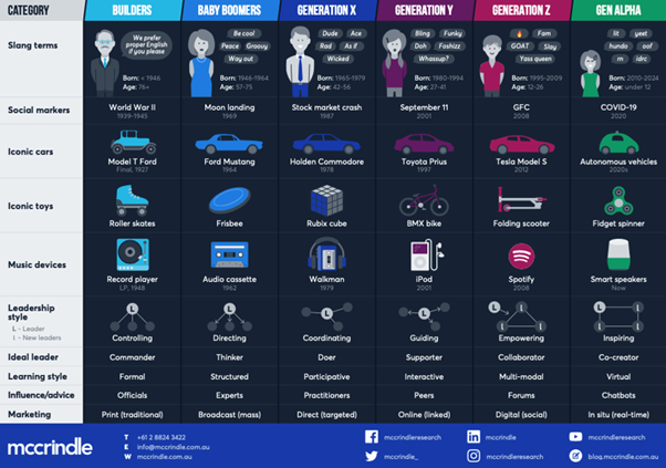 Using your client database, run a demographics report to understand what age bands the majority of your clients sit in. You could consider creating bands in the report to cover the main generations as follows: