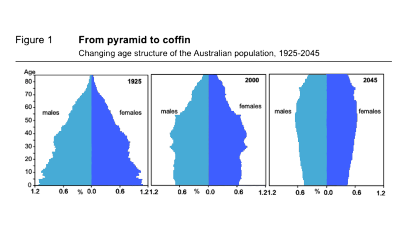 The future shape of Australia’s population is being called the demographic “coffin” to recognise the inversion of the population age structure from a pyramid with large numbers of young people (on the left), to the coffin with a more top heavy shape (on the right).