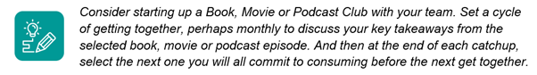 Insights can also be gained from the shared experience of podcasts, movies and books. To get you started, you could consider Die with Zero by Bill Perkins or Getting Naked by Patrick Lencioni.
