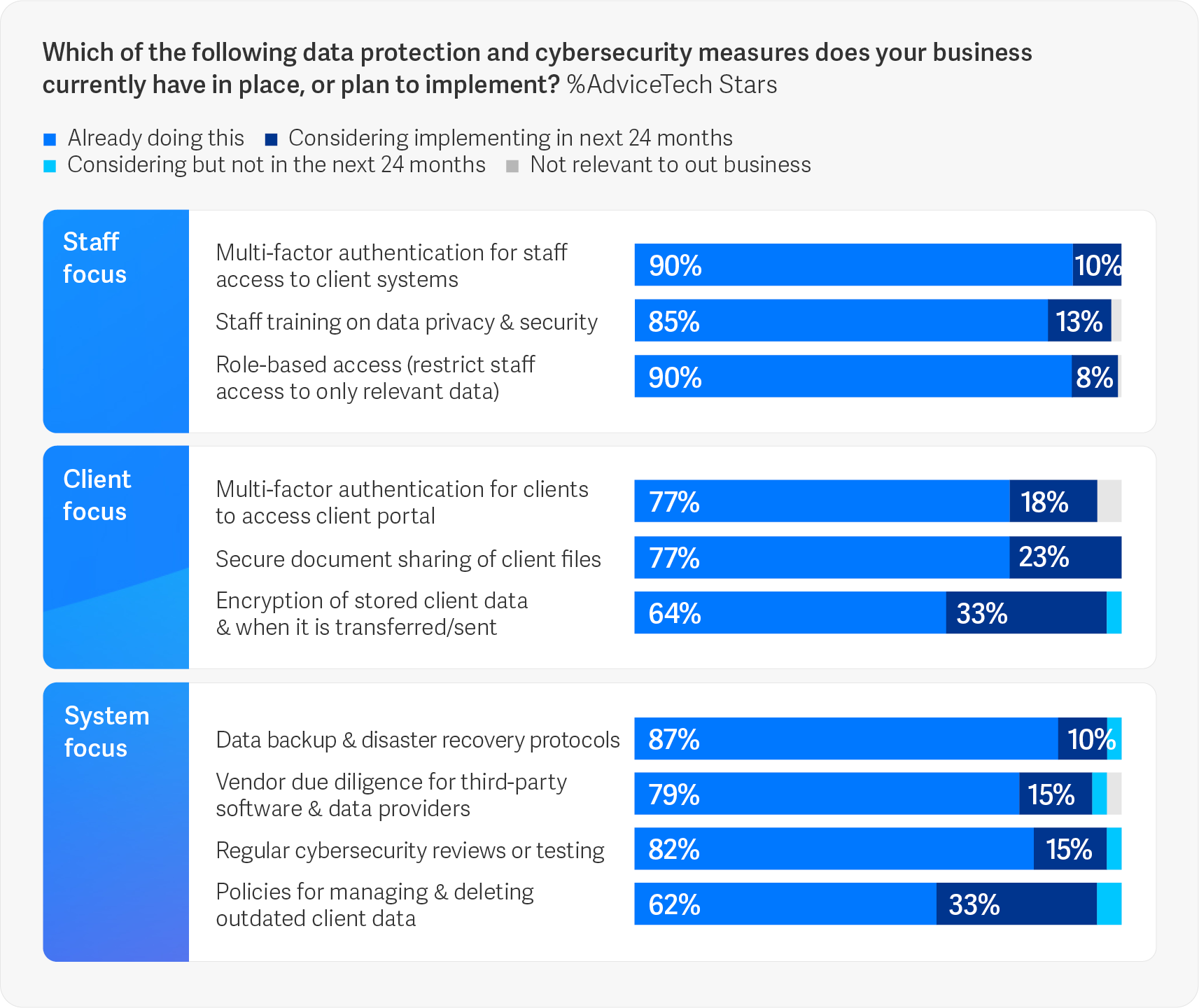 Beyond frontline security measures, AdviceTech Stars are investing in governance frameworks that support long-term resilience. The report reveals that 87% of Stars have backup protocols in place, ensuring that data can be restored quickly in the event of a system failure or cyberattack. These backups are often automated, encrypted, and stored in multiple locations to mitigate risk.